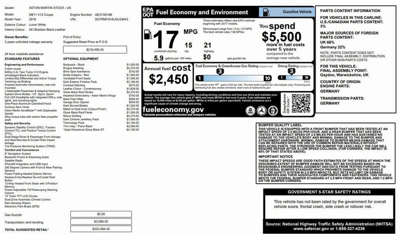 2018 Aston Martin DB11 Base RWD V12 Lunar White Clean CARFAX, Navigation, Leather Seats, Heated Seats, Backup Camera, Memory Seats, Cooled Seats, Premium Sound System, Premium Audio, Multi-Zone Climate Control, Bluetooth, Hands-Free, Technology Package, Contrast Stitching Color, Dark Bonnet Blades w/Black Meshes, Dark Exhaust Finisher, Dark Exterior Finisher Pack, Dark Front Grille, Dark Jewellery Pack, Embossed Aston Martin Wings Headrest Feature, Gloss Black Roof Panel, Gloss Black Roof Strake, Heated & Ventilated Front Seats, Navigation System, Nexus Seat Quilting Matched to Leather, Piano Black Trim Inlay, Q Brogue Detailing, Red Painted Brake Calipers, Wheels: 20'' 10-Spoke Silver Diamond Turned. Recent Arrival! Odometer is 5819 miles below market average!