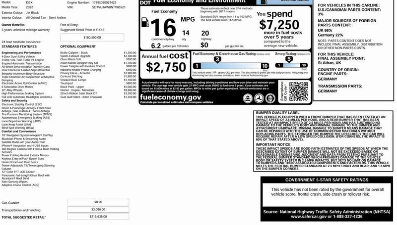 2022 Aston Martin DBX Base AWD 4.0L V8 Jet Black One Owner, Clean CARFAX, AWD, Navigation, Sunroof, Leather Seats, Heated Seats, Backup Camera, Memory Seats, Cooled Seats, Premium Sound System, Premium Audio, Multi-Zone Climate Control, Bluetooth, Hands-Free, USB Port, Portable Audio Connection, Apple CarPlay/Android Auto, Steering Wheel Controls, 12 Way Heated Comfort Seats, 14 Speakers, Adaptive suspension, Air Conditioning, AM/FM radio: SiriusXM, Apple CarPlay, Aston Martin Designer Key, Auto-leveling suspension, Black Painted Brake Calipers, Contrast Stitching, Four wheel independent suspension, Gloss Black Upper Package, Infotainment Touchpad & Dial, Memory seat, Navigation System, Power driver seat, Power steering, Power Tailgate w/Gesture Control, Power windows, Radio data system, Radio: Aston Martin Premium Audio System, Remote keyless entry, Smoked Tail Lights, Sports Exhaust System, Steering wheel memory, Steering wheel mounted audio controls, Wheels: 22'' Ribbon Satin Black Diamond Turned. Odometer is 1226 miles below market average!