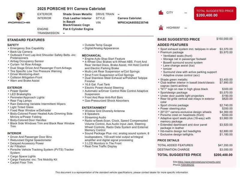 2025 Porsche 911 Carrera RWD 3.0L H6 Turbocharged DOHC 24V LEV3-ULEV70 388hp Shade Green Metallic Clean CARFAX, ***Still Under Factory Warranty**, 18-Way Adaptive Sport Seats Plus w/Memory Package, ABS brakes, Active Cruise Control, Adaptive Cruise Control, Alloy wheels, BOSE Surround Sound System, Club Leather Seat Trim w/Two-Tone Interior, Deviated Stitching Interior Package, Electronic Stability Control, Emergency communication system, Exclusive Design Taillights, Extended Dashboard & Door Panel Package in Leather, Extended Dashboard in Leather, Extended Door Panel in Leather, Front dual zone A/C, Front Ventilated Seats, HD-Matrix Design LED Headlights, Heated door mirrors, Heated front seats, Heated GT Sport Steering Wheel in Leather (2PJ), Illuminated entry, Ionizer, Lane Change Assist (LCA), Leather Seat Trim, Low tire pressure warning, Navigation System, Porsche Communication Management, Porsche Crest on Front Headrests, Power Steering Plus, Premium Package, Rear Lid Grille Vert Slat Inlays in Exterior Color, Remote keyless entry, Sound Package Plus, Sport Chrono Package, SportDesign Package, Storage Net in Passenger Footwell, Surround View w/Active Parking Support, Traction control, Under Door Puddle Light Projectors, Wheels: 20'' Fr/21'' Rr Carrera Exclusive Design. Recent Arrival! Odometer is 2428 miles below market average!